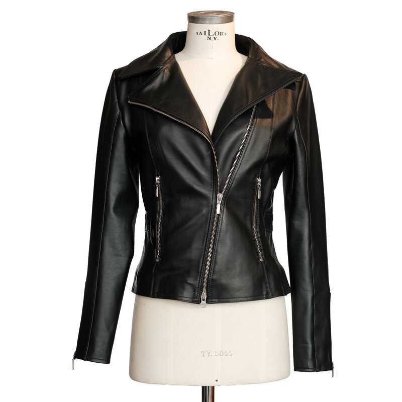 Schwarze Lederjacke von Cigno Nero. Hergestellt aus weichem und geschmeidigem Leder. Robustes, tailliertes Modell mit Kragen. Die Jacke wird mit einem 2-Wege-Reißverschluss geschlossen. Die Ärmel haben auch einem Reißverschluss . Versicherter Versand.